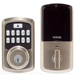 This Aura smart lock with a satin nickel finish by Weiser will provide a safe yet easy to use deadlock for your home. It can be locked or unlocked by using the keypad or a key from the outside as well as with the turn button from the inside. Using the Weiser App within Bluetooth range, you can lock or unlock your door and program up to 250 user codes that can be scheduled and customized on your smart phone. You can also receive notifications or view event history. The keypad features a one-touch lock button and the Smartkey technology allows you to rekey the lock in seconds. This product is BHMA grade 2 certified and it is backed by a limited lifetime warranty on mechanical parts and by a 1-year warranty on electronic components.