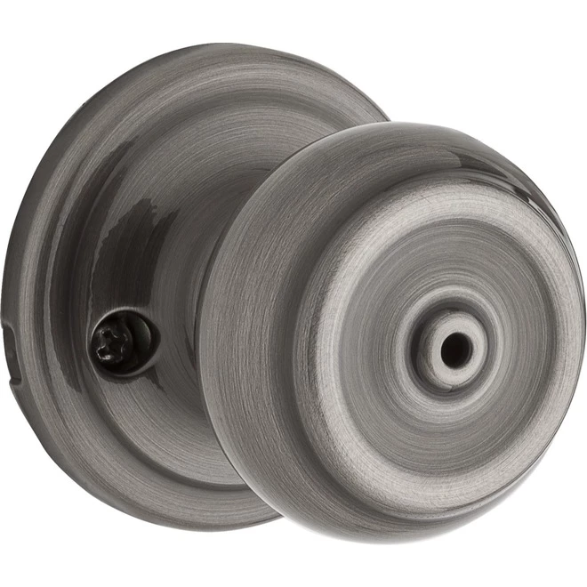 This Weiser Phoenix privacy door knob features a brass design, a classic antique nickel finish and a latch that can be adjusted from 2 3/8″ to 2 3/4″. The knob can be installed on any 1 3/8″ to 1 3/4″ thick standard door. This product features Microban(R) antimicrobial technology, preventing microorganism growth on surfaces. Limited lifetime warranty.