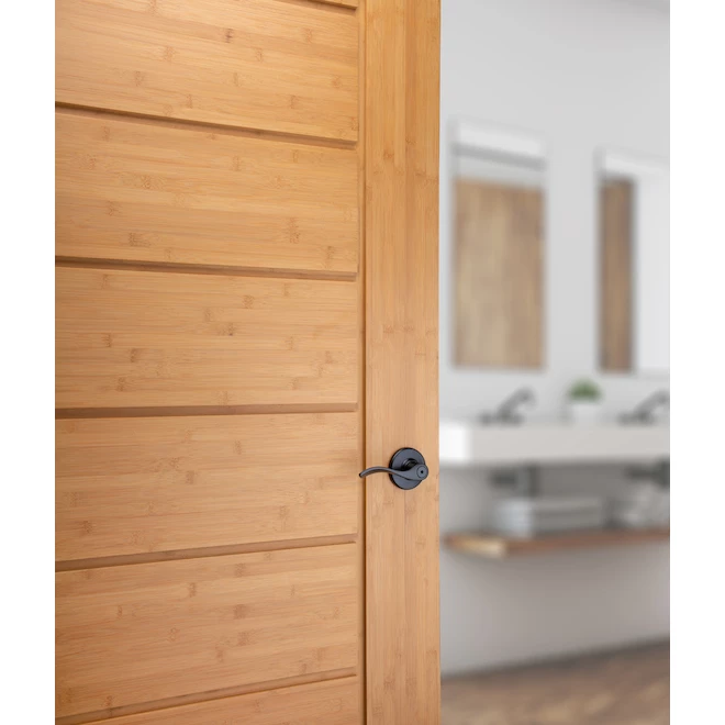 This Weiser Belmont privacy handle features curved aesthetics, a classic black iron finish and a 2 3/8″ to 2 3/4″ adjustable latch. It blends in any decor and fits in any standard door with a thickness ranging from 1 3/8″ to 1 3/4″. This product features Microban(R) antimicrobial technology, preventing microorganism growth on surfaces. Lifetime warranty.