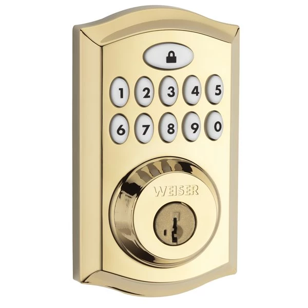 With Weiser you can blend simplicity with elegance. Whether you’re looking for traditional, transitional or contemporary style, our selection and finishes will make it easy to find the right accent for your home. This single cylinder deadbolt can be locked or unlocked by using the keypad or key from the outside as well as the turn button from the inside. The Polished Brass finish adds to the traditional look and feel of the product and makes a classic statement.
