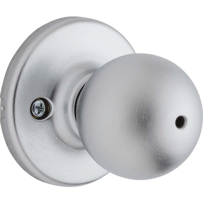 Privacy door knob. Made of brass. Satin chrome finish. Adjustable latch 2 3/8 in. and 2 3/4 in. For door thickness of 1 3/8 in. to 1 3/4 in. Lifetime warranty.